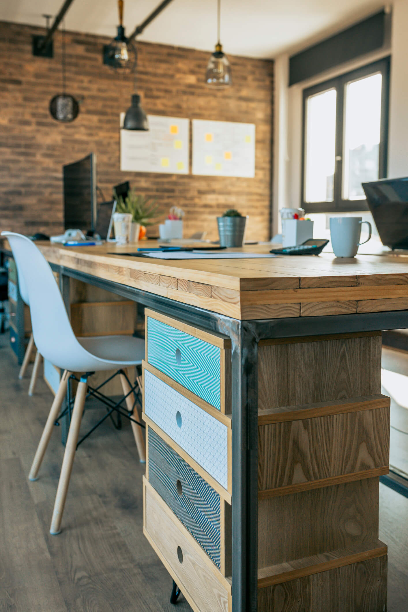 Consider how to best combine different aesthetics to theme the office interior. Large, open spaces lend themselves well to sleek industrial light fixtures, chairs and shelving units — but too much of that can feel cold and sterile. The use of wood or faux wood paneling brings a warm and natural touch when designing a workspace. Covering posts, beams and floors with wood panels breaks up static sightlines and brings in the look of the natural world. Placing more rustic elements throughout the space as accents and tables helps the office feel more inviting and comfortable.
